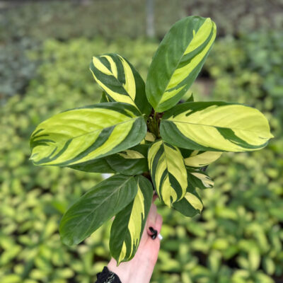 Round, oval-shaped leaves burst with bright yellow variegation. This ctenanthe likes medium light and frequent watering – you’ll know it’s time to water when the leaves curl!