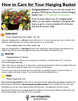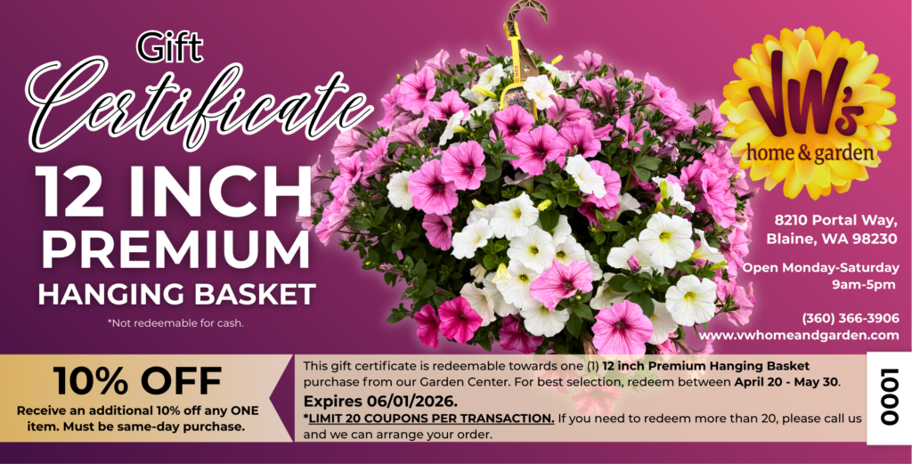 STEP 2: Your donors then come directly to VW’s Home & Garden retail center in Blaine, WA OR  Mount Vernon (STAY TUNED!) between April 13th – June 1st, 2026 to pick out a 12” premium hanging basket of their choice.